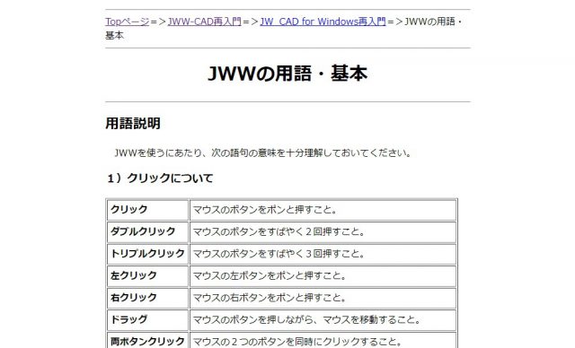 もとがフリーソフトですので取扱説明書のようなものがなく、利用するユーザー同士のコミュニティーから現状の汎用まで拡大されてきました。ですので、用語については「クリック」などの基礎的なものからツールバーの名称など、画像付きで丁寧に説明されています。JWW-CADの「かんたんマニュアル」のようなサイトです。