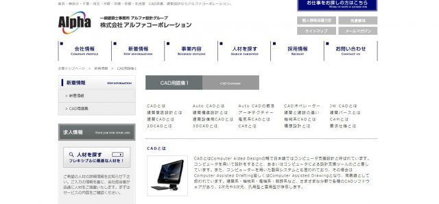 建築設計などを請け負っているアルファ設計さんのアウトソーシング事業であるアルファコーポレーションさんのサイトです。設計分野に特化しているので、自社で初心者向けのCADスクールを運営するなど、CADエンジニアの人材育成に注力されています。