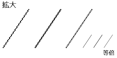 このギザギザを緩和し、滑らかな画像表現に処理をすることをアンチエイリアシングと言う。CADソフトに於いてはベクトル画像で作られた線データである為、印刷時にギザギザが出ることはない。