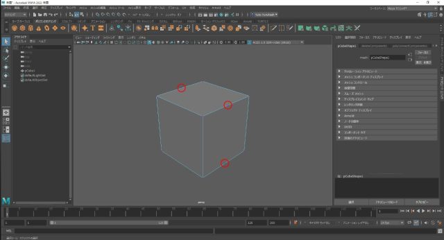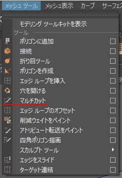 このツールは、メッシュの好きな部分にエッジを追加することができます。任意の場所にエッジを追加する際に使用することが多いです。メニューよりメッシュツール→マルチカット(Multi Cut Tool)を選択します。