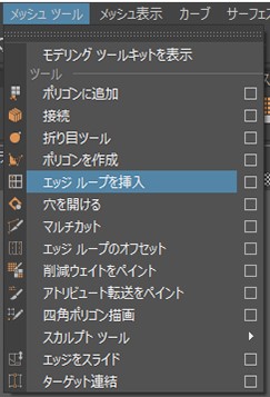 このツールは、任意のエッジやフェースに沿って、モデルの選択エッジの垂直方向にエッジを挿入することができます。メニューよりメッシュツール→エッジループを挿入(Insert Edge Loop Tool)を選択します。