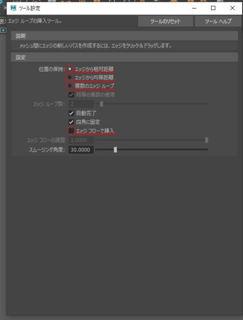 エッジループを挿入を使う際、ツールセッティングが重要です。赤枠の部分に使いたい用途に分けてチェックを入れましょう。