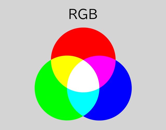 光の三原色である、赤(Red)・緑(Green)・青(blue)を表す言葉で、混ぜると白色に近づく色の表し方(加法混色)です。モニターやテレビの画面の様な発光する媒体で使用されている色の表現方法です。