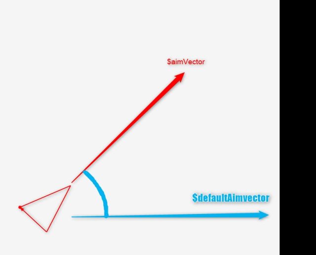 では二つのベクトルから織りなされる角度を導き出していきましょう。一つを基準のベクトル($defaultAimVector)とし、現在のベクトルを「$aimVector」とし比較をします。