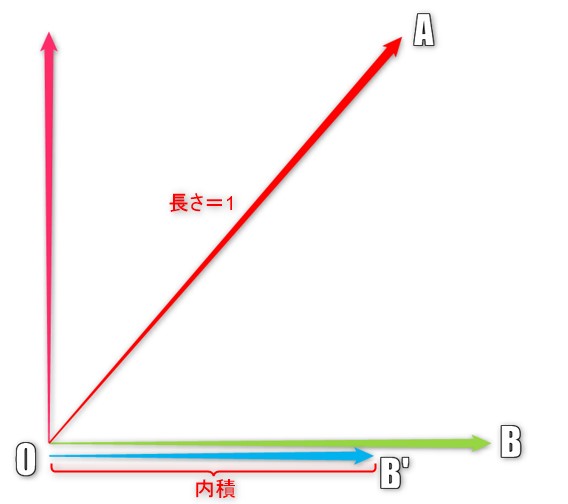 OB’の長さがわからないためOAの長さを使って求めていきましょう。ベクトルAの内積を下記の図の様に表していき