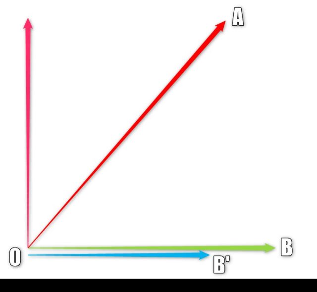 三角関数を使って考えていきましょう。下記の画像の様に限定をOとし2点をAとBとします。A迄のベクトルから垂直に下に実線を引いた場所をB’とすると、cosθ=OB’/OAと表す事が出来るので、逆三角関数(acos)が使えるため、角度θを求める事が出来ます。